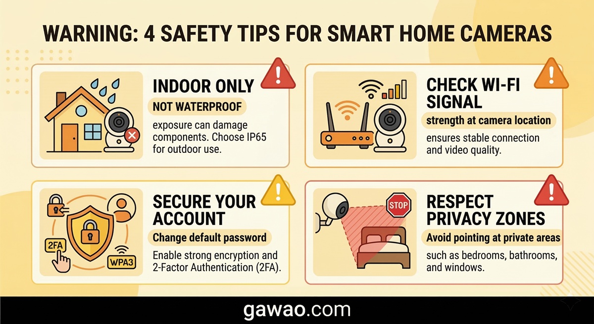 เปลี่ยนรหัสผ่าน Wi-Fi ให้แข็งแรง — กล้อง Smart Home เชื่อมผ่าน Wi-Fi ถ้ารหัส Wi-Fi อ่อน มีโอกาสที่คนอื่นจะเข้ามาดูภาพได้ ควรใช้รหัสผ่านยาวอย่างน้อย 12 ตัวอักษรและเปิด WPA3 ถ้า Router รองรับ