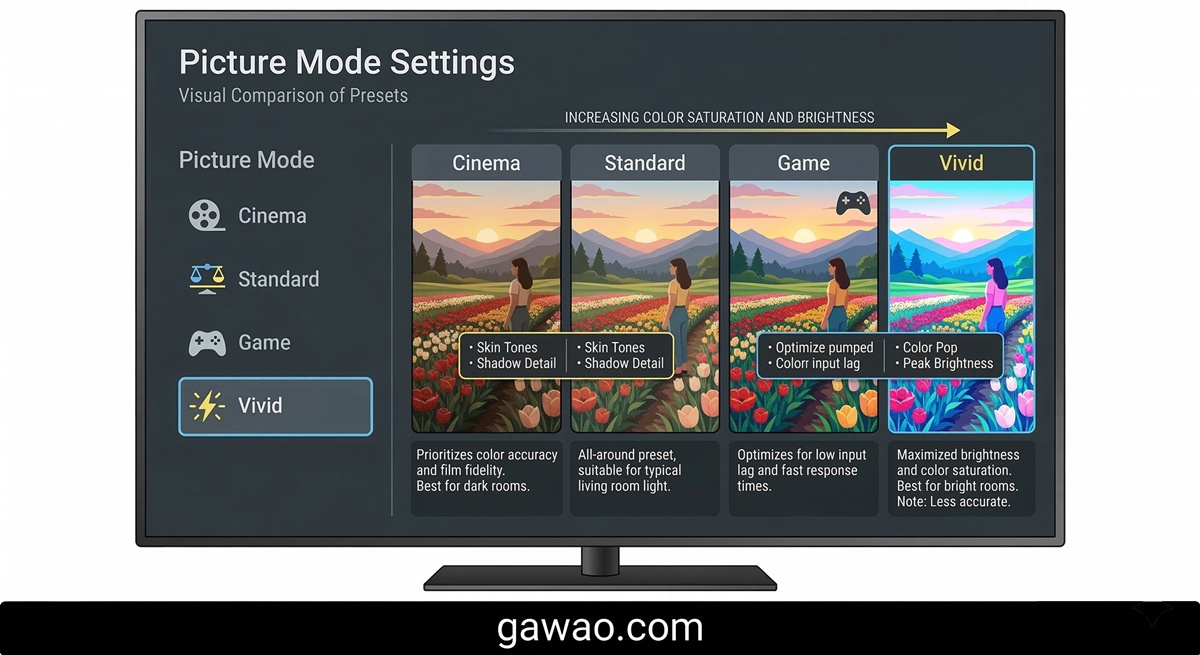 ทีวีส่วนใหญ่ตั้งค่า Default เป็นโหมด Vivid หรือ Dynamic เพื่อให้ภาพดูสว่างใน Showroom แต่ที่บ้านควรปรับเป็น: