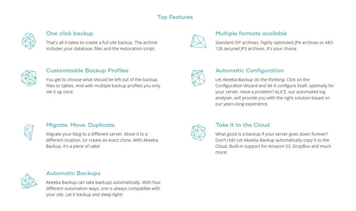 เป็นปลั๊กอินที่เติบโตมาจากฝั่ง CMS Joomla ก่อน แล้วก็มีการขยับขยายมา Support WordPress ในภายหลัง ฟังก์ชั่นหลัก ๆ ก็คือการ Backup ข้อมูลทั้งเว็บไซต์ของเรา ทั้งไฟล์เว็บ เนื้อหา ฐานข้อมูล และบีบสิ่งเหล่านั้นเอาไว้เป็นไฟล์เดียว โดยสามารถเลือกได้ว่าจะให้เก็บเป็น Zip หรือ JPA (รูปแบบการบีบอัดที่ทาง Akeeba คิดขึ้นมาเอง) แถมยังมีฟังก์ชั่นอื่น ๆ ที่อาจจะต้องเสียเงินเพื่อให้สามารถใช้งานได้ เช่น Backup to Cloud, Schedule backup เป็นต้น แต่โดยส่วนตัวสำหรับผมแล้วนั้น เวอร์ชั่นฟรีก็ความสามารถเหลือเฟือแล้ว